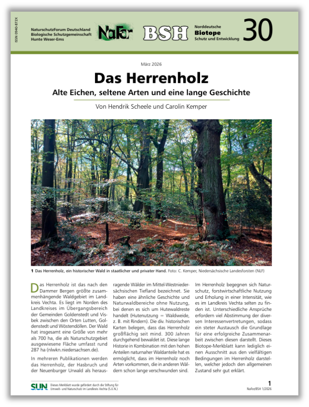 Hendrik Scheele, Untere Naturschutzbehörde des Landkreises Vechta, und Carolin Kemper, Betriebsdezernentin im Forstamt Ahlhorn, stellen auf zwölf Seiten, illustriert mit eindrucksvollen Fotos, die ökologische Bedeutung dieses historischen Waldgebietes im Nordkreis Vechta dar. Gefördert wurde der Druck des Merkblattes von der Stiftung für Umwelt- und Naturschutz im Landkreis Vechta. Es ist in der Printversion in der NaFor-BSH-Geschäftsstelle zu erhalten oder digital auf der Webseite der BSH herunterzuladen: www.bsh-natur.de/… merkblatt_30_biotope_herrenholz.