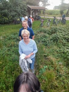 Spannende und aufschlussreiche Informationen erhielten die Teilnehmenden der Fahrradexkursion in die Bockholter Dose und die Vreeser Wiesen am letzten Wochenende. Bei der Gemeinschaftsveranstaltung der Biologischen Schutzgemeinschaft Hunte Weser-Ems e.V. (BSH) und des Umweltbildungszentrums (UBZ) Vrees ging es zunächst vom UBZ aus Richtung Moorlehrpfad und Bockholter Dose. Wer kein eigenes Fahrrad dabeihatte, radelte auf den UBZ-Fahrrädern, die bei Gründung des Zentrums – wie zahlreiche andere Ausstattungsgegenstände – von der BSH finanziert worden waren.